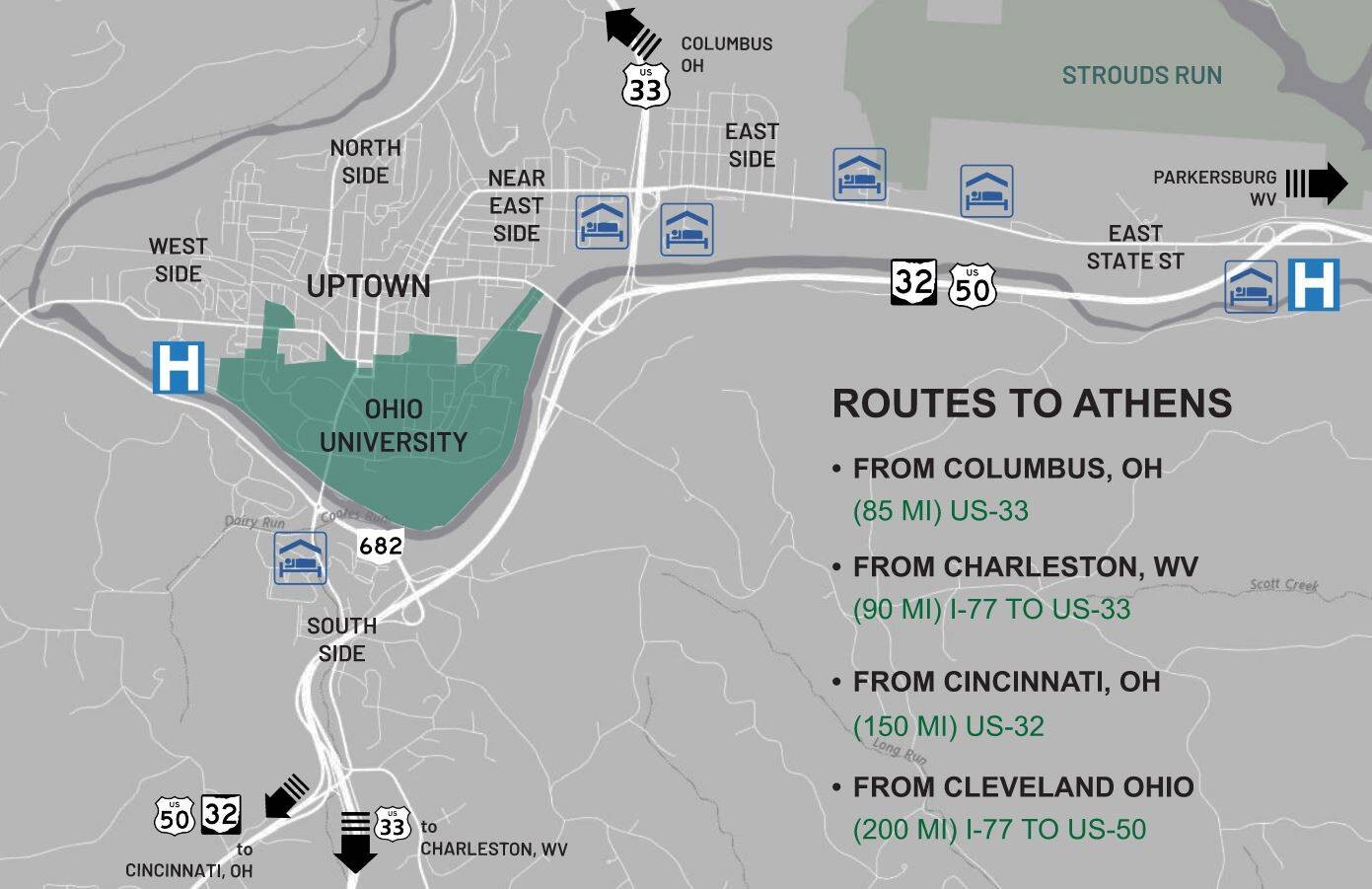 For visiting guests, Athens is located in southeast Ohio approximately 90-minutes from Columbus and 45-minutes from Parkersburg, WV. The City of Athens and Ohio University are located at the intersection of US-33 and US-50, as shown below, with Bird Ice Area in the middle of the university campus.