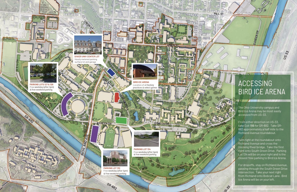The AYHA has been at the Bird Ice Arena on Ohio University’s campus for over 60 years, and while many locals are familiar with getting to the rink, those arriving for the first time can sometimes take a wrong turn and through a series of one-way streets wind up on the far side of Athens. With that in mind, please use these helpful maps, directions, and advice to make your journey smooth.