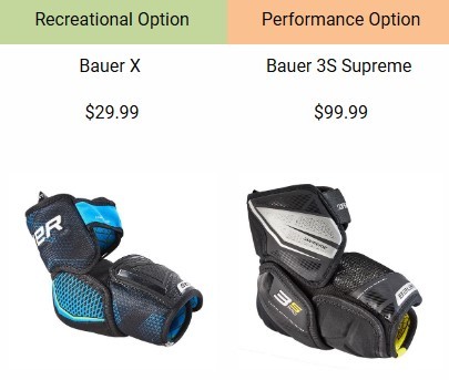 Performance elbow pads will typically offer more protection, covering the entire forearm and bicep area, whereas Recreational options will bridge that area with a velcro strap. Less expensive pads also tend to be lighter, less bulky, and have a bit more mobility to them. However, a youth player can find themselves just as reliably protected, especially from falls, with less expensive models as the pricier ones.