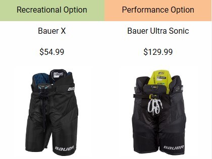Performance equipment has a mid-range cost and is generally intended for intermediate to advanced hockey players who need their equipment to handle multiple practices and games every week, like youth players in and A and B leagues.