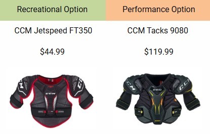 Recreational equipment is the least expensive and is intended for beginners, House leagues, or occasional drop-in hockey players.
