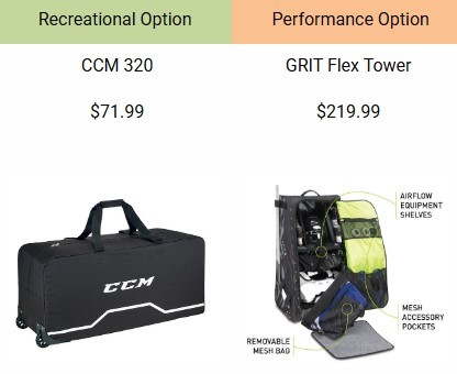 The GRIT Flex Tower features an internal frame, multiple pockets, shelving, a roll-out foot carpet, and can carry a stick on the outside. In contrast, the CCM 320 is a big, empty bag with wheels. While the GRIT may appeal to the parent who envisions their child as highly organized, more often than not a youth player’s bag is a disorganized mess of equipment stuffed inside with little to no thought, which the CCM 320 and many other manufacturers' bags can handle more than adequately.