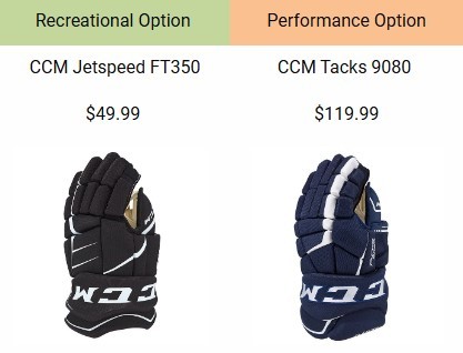 Cost Savings Tip: if your child's hands are growing fast, lean towards the recreational models; they are likely to be outgrown before they wear out. Also look for discounts - at the time this article was written, the CCM Jetspeed FT350 was 30% off retail.